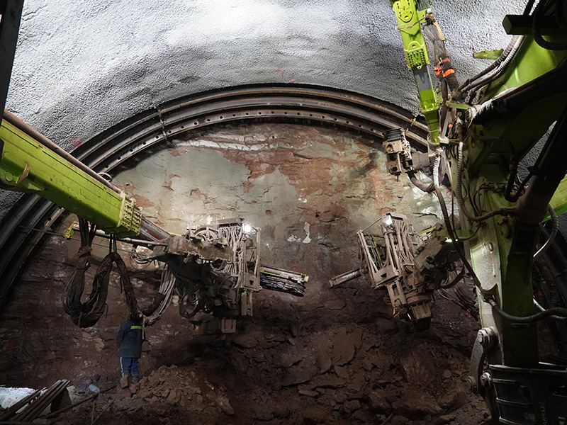 LH-150Y掘進支護一體機組是藍海智能針對隧道掌子面施工開發(fā)集掘進開挖、支護、噴漿、打錨桿作業(yè)等功能于一體的集成化施工,實現(xiàn)掌子面全工序作業(yè)設備。具備非爆掘進、鉆爆掘進、出渣、立架、打鎖腳和錨桿、注漿、噴漿等進行平行作業(yè)能力,能滿足鐵路單洞雙線隧道、高速隧道、市政隧道、鐵路小斷面隧道施工作業(yè),一次掘進隧道斷面尺寸寬度14-16米,掘進高度7.8米以上,相比現(xiàn)在采用單工序循環(huán)作業(yè)方式,每班提升效率50%~60%。